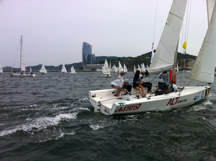본부정의 신호에 맞추어 전속력으로 출발하는 요트들