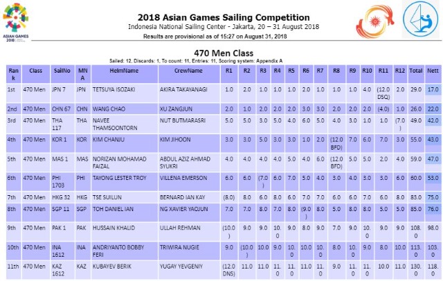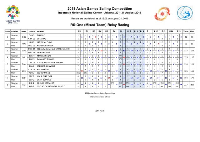 레이저 레이디얼 김지아(이화여자대학교) 선수 7위, 레이저 4.7 김다정(충남해양과학고등학교), 김동욱(동원고등학교) 선수 각각 7위, 15위, 혼성부 RS:One 김새봄(인천공항고등학교), 서영길(부산요트협회) 선수 6위로 아시안게임을 마무리 했습니다.