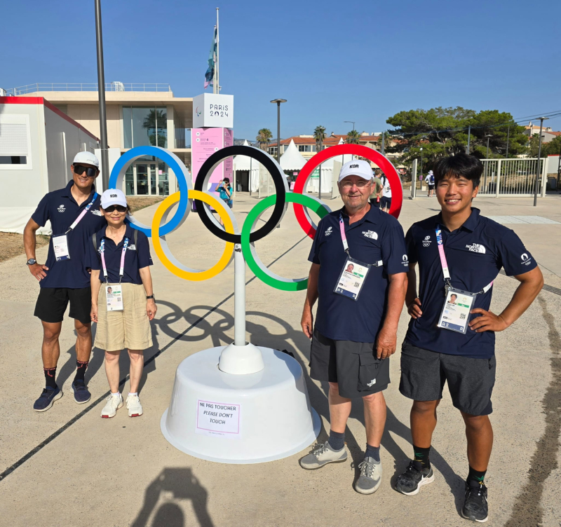 마르세유 올림픽요트경기장에서 하지민 선수, 윌 (Wil van Bladel) 코치님, 윌 코치님 배우자 변형혜님, 이민제 선수 (훈련 파트너 겸 윌 코치 보조)가 사진을 보내왔습니다.