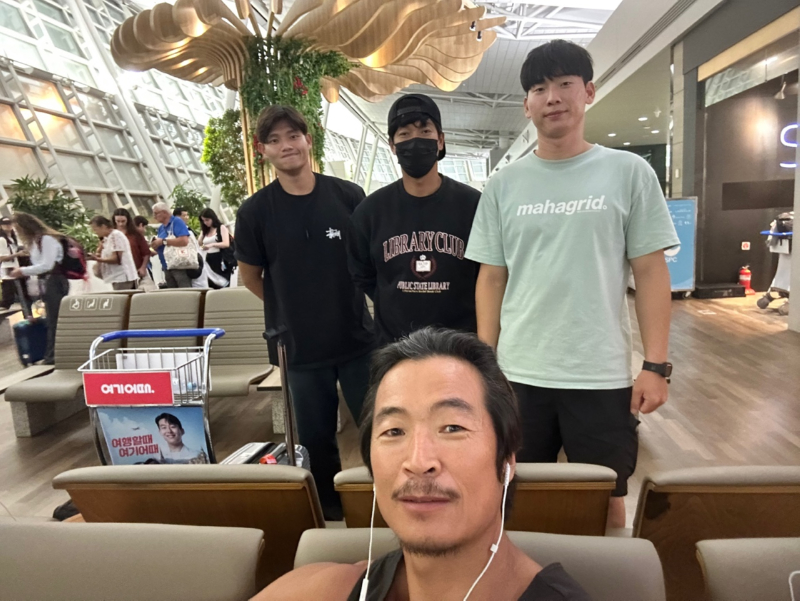 스위스로 향하는 중 (뒷줄 좌측부터 손지원 선수, 이태훈 선수, 최군학 선수, 앞줄 옥덕필 코치)