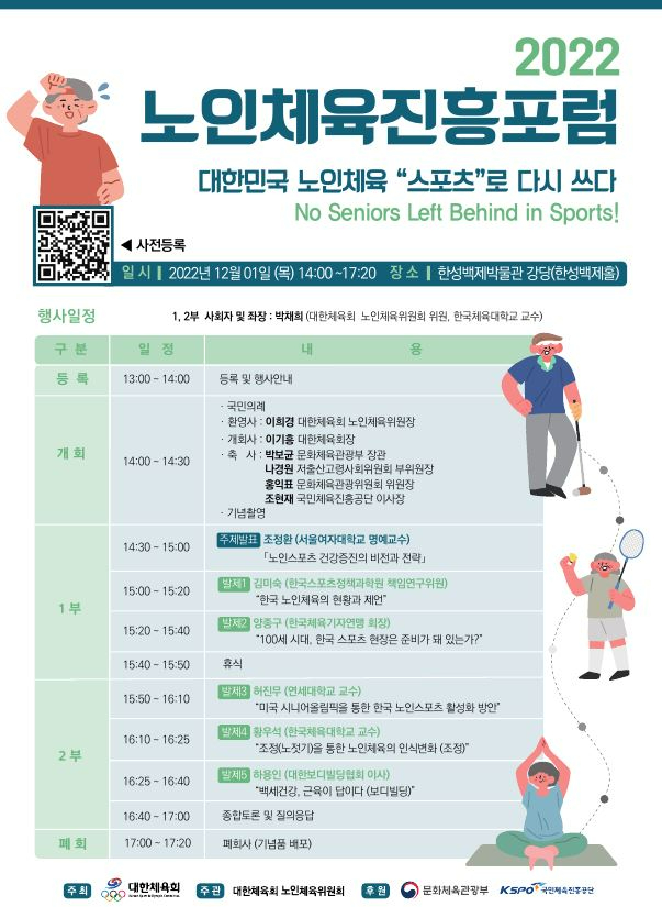 노인체육의 사회적 공감대를 형성하고, 노인체육 전반의 현안논의 및 개선방안 도출 등을 위하여 대한체육회는 아래와 같이「2022 노인체육진흥포럼」을 개최합니다.